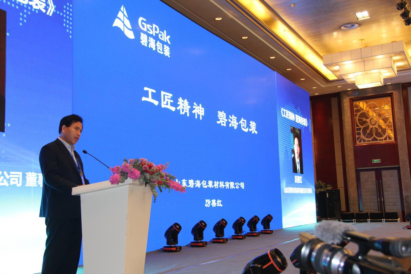 山東碧海包裝材料有限公司董事長厲善紅在第七屆亞洲食品裝備論壇暨中國食品和包裝機(jī)械工業(yè)協(xié)會第二十七屆年會上做題為《工匠精神 碧海包裝》的發(fā)言